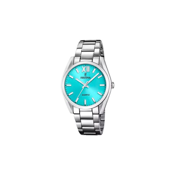 Diese Damennuhr F20622/D mit 37-mm-Gehäuse hat ein Quarz-Werk, ein türkis farbenes Zifferblatt mit Strichen und ein Edelstahl-Armband.