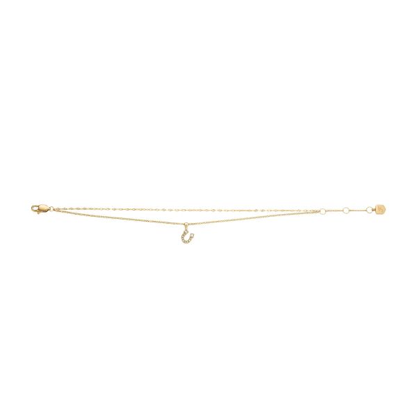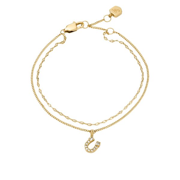 Dieses mehrreihige Armband aus poliertem, goldfarbenem Edelstahl besticht durch sein durchdachtes Design. Ein zarter Hufeisenanhänger ziert eine der beiden Reihen und schafft Dimension, während der sichere, verstellbare Karabinerverschluss für eine gute Passform sorgt. Dieses Armband lässt sich ausgezeichnet solo tragen oder mit anderen Armbändern kombinieren.