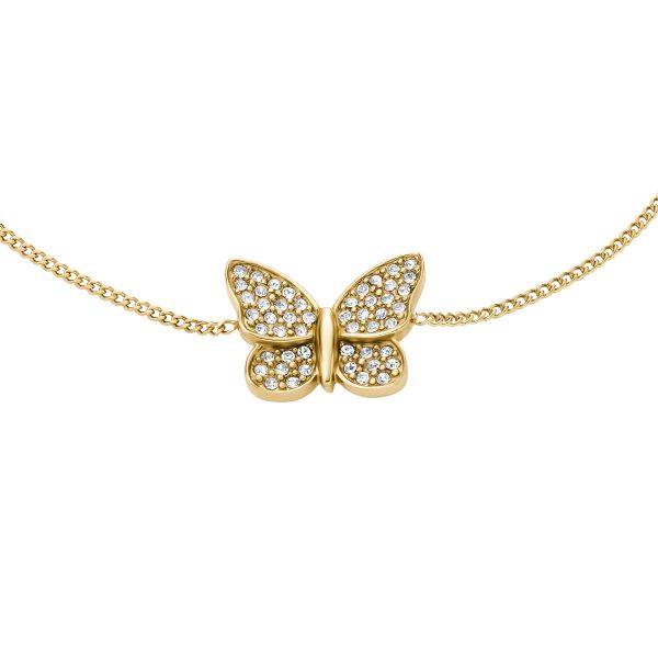 Dieses Armband steht für Selbstvertrauen und Verwandlung. Der Schmetterling aus goldfarbenem Edelstahl ist mit Pavé-Glassteinen verziert. Die filigranen Details fangen das Licht ein und verleihen dem Design einen subtilen Schimmer. Der Karabinerverschluss sorgt für eine sichere und verstellbare Passform für angenehmes Tragen. Seine schlichte Silhouette macht ihn zu einer mühelosen Ergänzung für jede Schmucksammlung.
