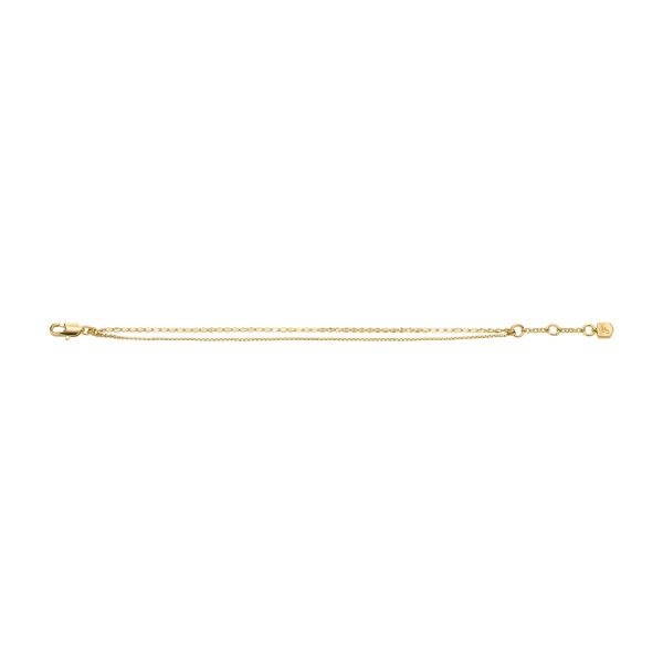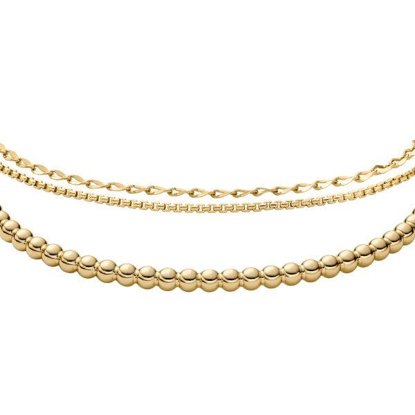 Das Fossil Schmuckset JA7293SET besteht aus zwei goldfarbenen Armbändern aus poliertem Messing: eines mit filigraner Gliederkette und Karabinerverschluss, das andere schlicht mit dekorativen Kugelelementen in Perlenoptik.