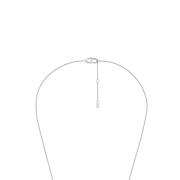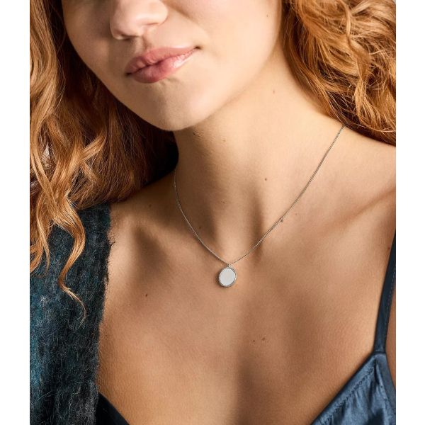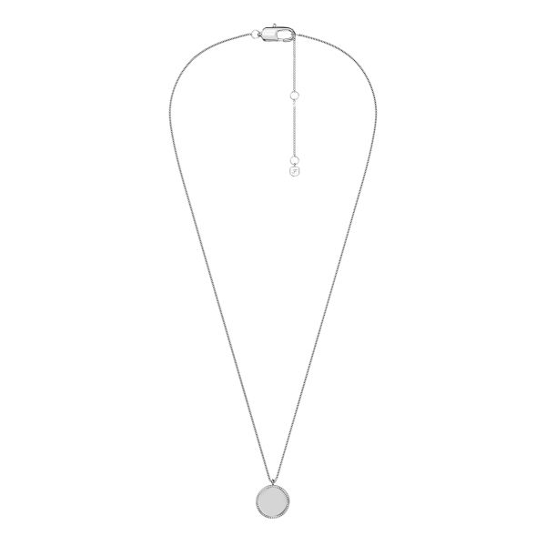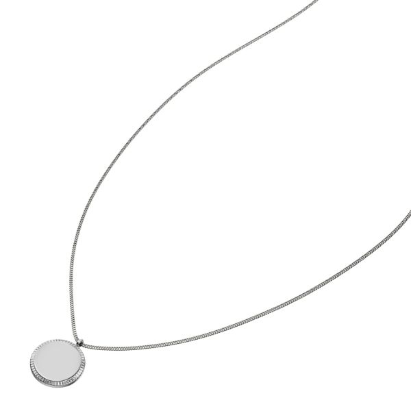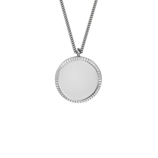 Diese Halskette aus poliertem, silberfarbenem Edelstahl verfügt über eine elegante, gravierbare Scheibe, die an einer zarten Kette hängt. Strukturierte Details entlang der Kante sorgen für einen subtilen Kontrast, während ein Karabinerverschluss ein sicheres und müheloses Tragen gewährleistet.