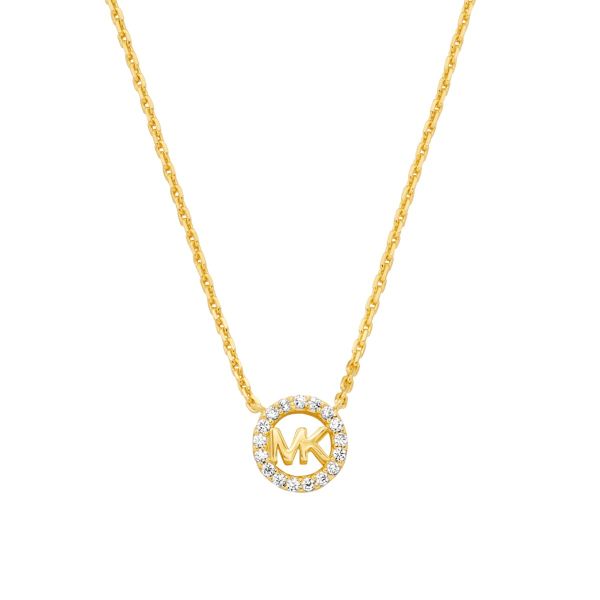 Die KORS MK-Schmuckkollektion feiert Michaels Leben und Werk mit dem charakteristischen MK-Logo als Kerndesignelement. Dieser filigrane Anhänger präsentiert das MK-Fulton-Logo, umrahmt von einem Halo aus kubischem Zirkonia-Pavé. Die Halskette besteht aus Sterlingsilber, ist mit 14K Gold überzogen und misst 15 Zoll in der Länge. Sie verfügt über einen Federringverschluss mit verstellbaren Sprungringen – das perfekte Accessoire für den Alltag!