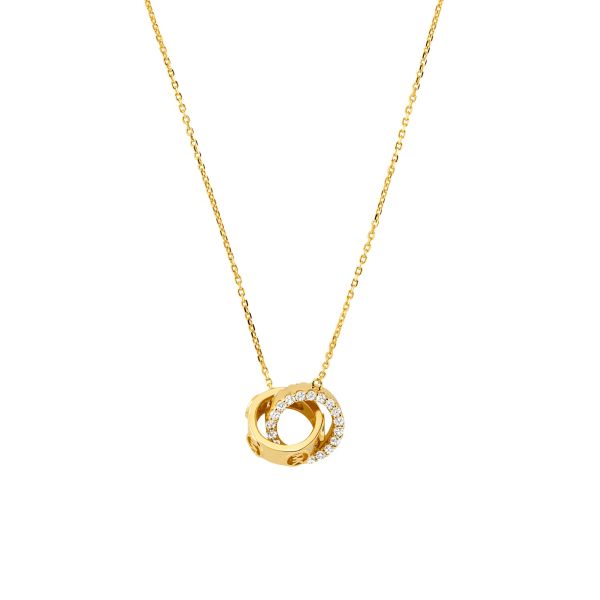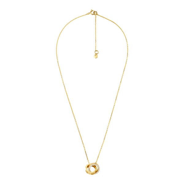 Elegante Michael Kors Damen‑Halskette mit Anhänger aus Sterling‑Silber, gelbgoldfarben veredelt. Das Design mit verschlungenen Ringen und MK‑Logo wird durch funkelnde weiße Zirkonia akzentuiert – ideal für Alltag und besondere Anlässe.