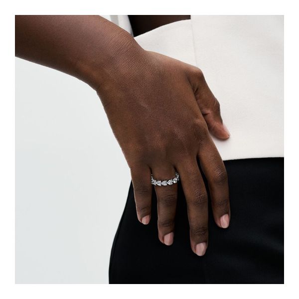 Setze ein starkes Zeichen der Liebe mit dem Herzreihe Ewigkeits-Ring. Herzförmige Steine und V-förmige Krappen wiederholen sich und bilden diesen funkelnden Ewigkeitsring – eine moderne Interpretation der klassischen herzförmigen Fassung. Trage ihn als Symbol für ewige Liebe oder kombiniere ihn mit unseren anderen Pandora Timeless Ewigkeitsringen für maximales Funkeln. Passt perfekt zu den passenden Funkelndes Herz Creolen für einen edlen Valentinstagslook.