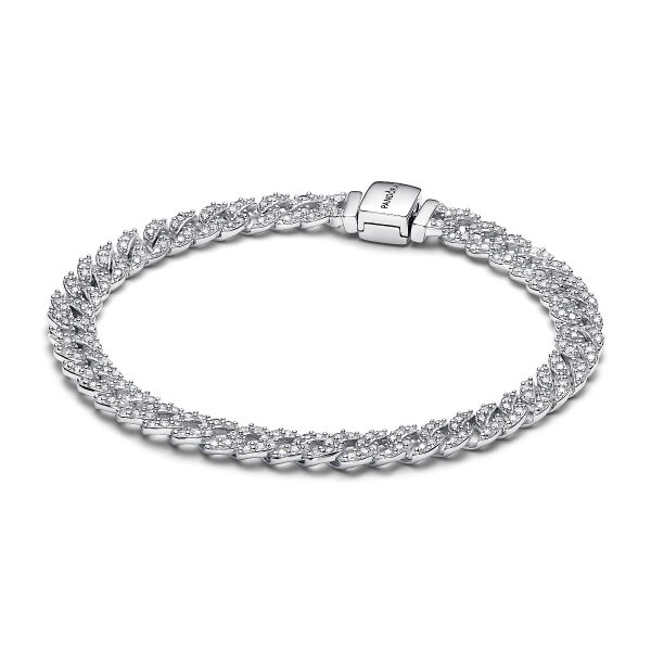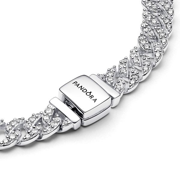 Verleihe deinem Look mit dem Pandora Timeless Pavé Gliederarmband einen eleganten Touch. Dieses Armbands aus Sterling-Silber verzaubert mit einer funkelnden Gliederkette. Die Oberseite jedes Halbkreises ist mit drei runden Steinen besetzt, während die Rückseite der Kette für noch mehr Glanz und Komfort poliert ist. Der flache, quadratische Verschluss des Armbands ist mit einem eingraviertem Pandora Logo verziert. Dieses Sterling-Silber Kettenarmband kombiniert die lineare Geometrie unserer legendären Ketten mit funkelndem Pavé – ein zeitloses Schmuckstück mit einem modernen Touch.