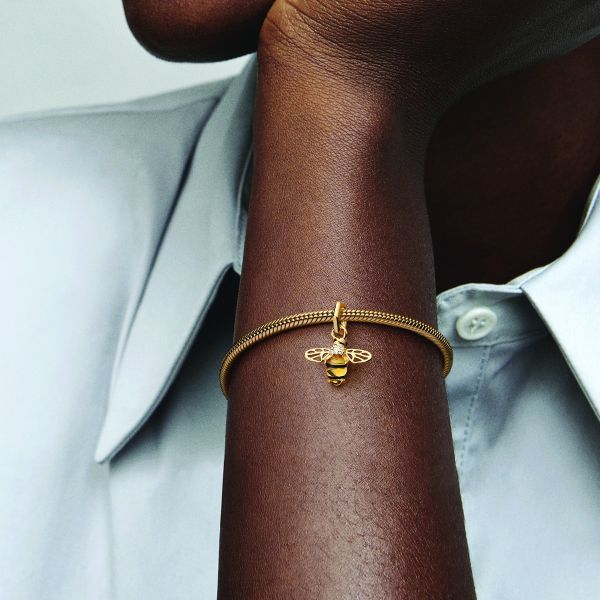 Sei die Königin, die du bist – mit dem Funkelnde Biene Charm-Anhänger. Dieser Charm-Anhänger hängt an einem wabenförmigen Verbindungsring, wobei seine offen gearbeitete Flügel lebensechte Muster erzeugen. Der Körper der Biene ist aus einem gelben künstlichen Kristall im Cabochon-Schliff gefertigt, der mit Emaillestreifen überzogen ist und erhält eine goldene Honigfarbe, wenn das Licht hindurchscheint. Klare Cubic Zirkonia-Schmucksteine verleihen den Flügeln der Biene ein besonderes Funkeln. Dieses Bienen-Charm symbolisiert Weisheit, Reichtum und Wiedergeburt und verleiht deinem Schmuck einen Hauch von Naturkraft.