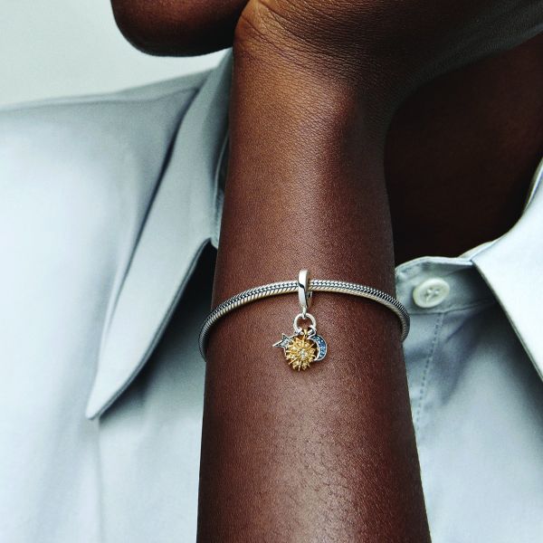 Bringe mit dem Bicolor Himmlischer Dreifacher Charm-Anhänger himmlischen Zauber in dein Styling. Dieses Charm kombiniert drei himmlische Symbole: ein Sonnenmotiv in mit funkelnden Steinen und Mikroperlen, einen Stern aus Sterling-Silber mit klarem Pavé und einen Halbmond aus Sterling-Silber mit tiefblauen Steinen. Trage es als Symbol für Gleichgewicht und Harmonie, im kosmischen Tanz des Universums und in uns selbst.