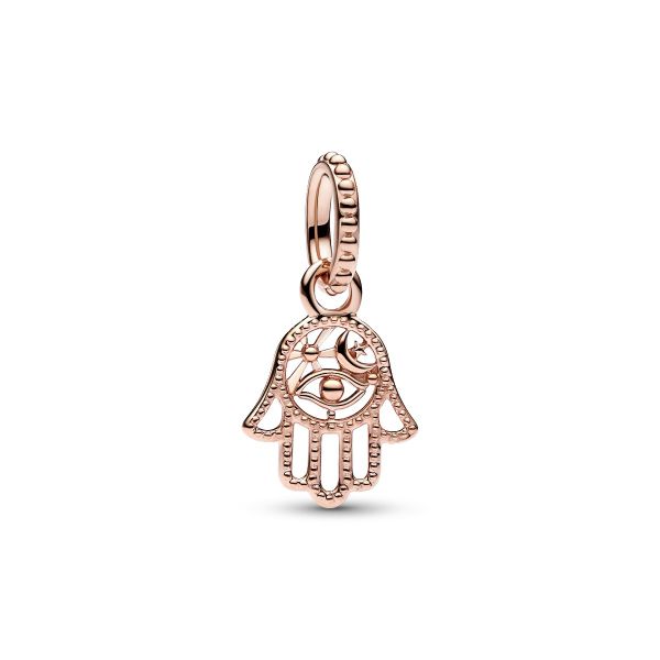 Der Hand der Fatima Charm-Anhänger bringt positive Energie in dein Leben. Dieses Hand der Fatima-Charm hat ein aufwendiges, offen gearbeitetes Design und hängt an einem perlenbesetzten Verbindungsring. Das Innere der Hand zeigt ein Auge, Strahlen und eine Mondsichel, deren Umrisse mit den für Pandora charakteristischen Perlendetails verziert sind. Die Hand der Fatima wird traditionell als Talisman zum Schutz vor dem Bösen getragen, gilt aber auch als Segen spendende Geste, die Freundschaft und Anmut in dein Leben bringt.