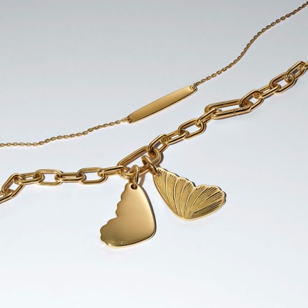 Verwandle deinen Look mit einem Symbol für Freiheit und Naturschönheit. Eine Seite unseres 14 Karat vergoldeten Schmetterlingsanhängers hat einen strukturierten Flügel, während die andere Seite poliert und für die Gravur bereit ist.