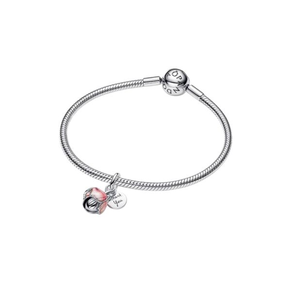 Mit Dankbarkeit blühen. Unser Blüten-Anhänger aus Sterling-Silber öffnet sich in drei Blütenblätter mit einem 14 Karat vergoldeten Mittelpunkt, einem grünen künstlichen Kristall und glitzerndem rosafarbenem Harz, und ist auf der Scheibe mit der Gravur „Thank you“ verziert.