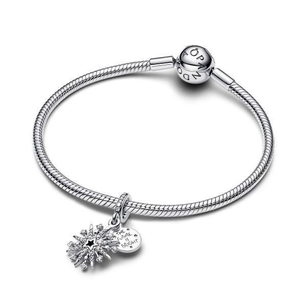 Ergänze deine Sammlung mit unserem feierlichen Funkelndes Feuerwerk Doppelten Charm-Anhänger für sternengleichen Spaß. Der Charm-Anhänger aus Sterling-Silber ist mit einem ausgestanzten Stern weiteren mit leuchtenden Sternen, Metallspitzen und funkelnden Steinen versehen, die Feuerwerksfunken symbolisieren und aus der Mitte strahlen. Der zweite Anhänger trägt die Botschaft „THE FUTURE IS BRIGHT“.