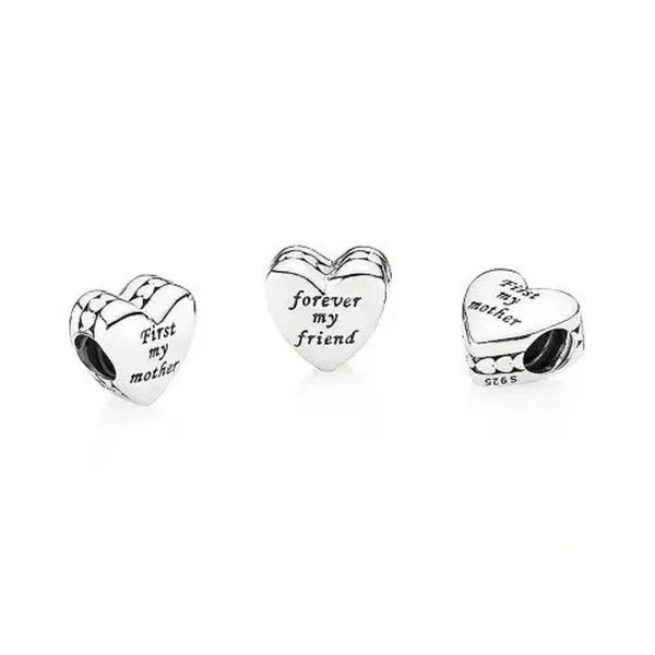 Pandora Charm Herz mit einer Gravur "First my mother, forever my friend" aus Sterling-Silber.