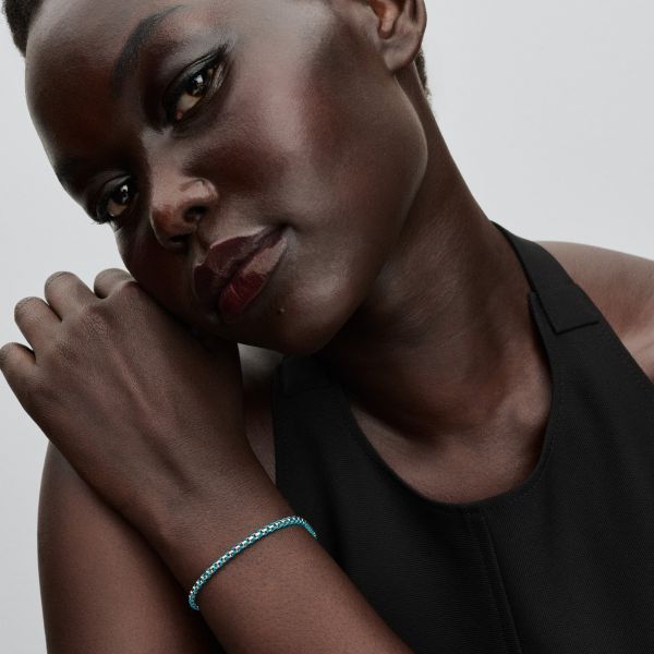 Geflochtene Kastenkette aus Sterling-Silber mit türkisfarbener Textilkordel. Veredle deinen Stil mit einer einzigartigen Kombination aus Stoff und Metall.