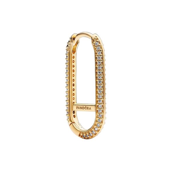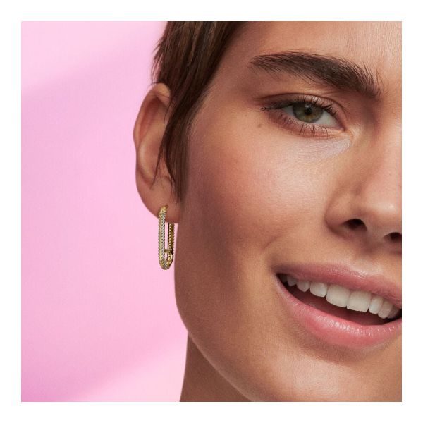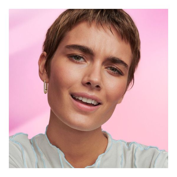 Setze ein Statement mit dem Pandora ME Verlängerter Pavé-Link Einzelner Ohrring. Dieser 14 Karat vergoldete, längliche Creolen-Ohrring hat einen waagerechten Querbalken in der Mitte und zwei Reihen Pavé an den Außenseiten. Er lässt sich maximal stylen, sodass du drei Mini-Charm-Anhänger oder ein Medaillon-Charm, einen Styling-Link oder einen zu öffnenden Link am unteren Teil des Ohrrings hinzufügen kannst. Je mehr Optionen, desto besser.