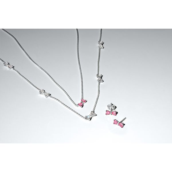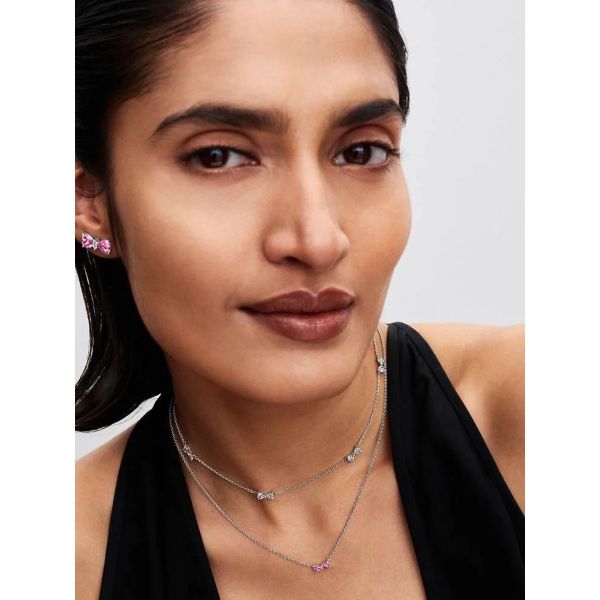 Manche Bindungen lassen sich nie lösen. Trage unsere Schleife Ohrstecker aus Sterling-Silber mit herzförmigen rosafarbenen und klaren Cubic Zirkonia als zartes Symbol der Anmut.