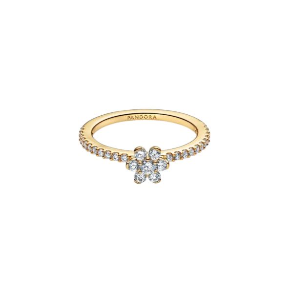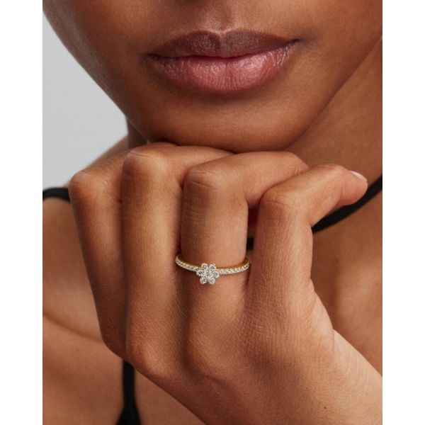Ein perfekter Blütenmoment. Unser 14 Karat vergoldeter Ring hat eine erhabene Blume mit klaren Steinen und ein Halb-Pavé-Band. Dein neues funkelndes Lieblingsstück für ein Stacking, das jeden Look aufwertet.