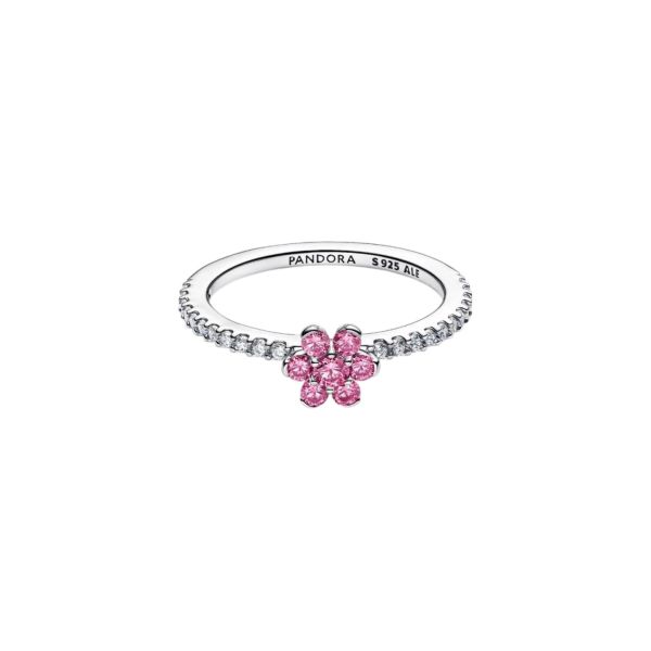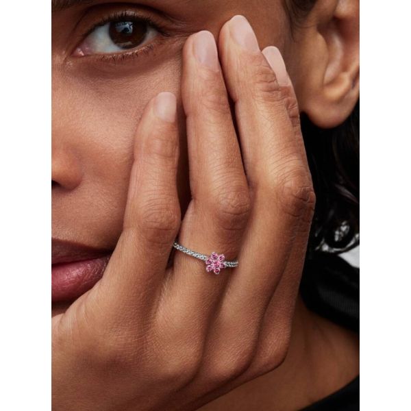 Blumig und funkelnd. Dieser Ring aus Sterling-Silber hat eine erhabene Blumenfassung mit rosafarbenen Steinen und ein halbes Pavé-Band. Ein funkelndes Statement, das jedes Outfit aufwertet.