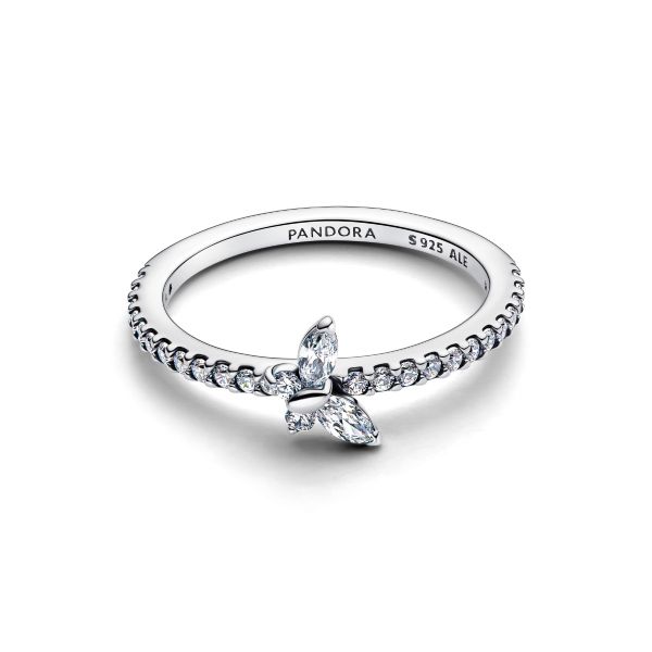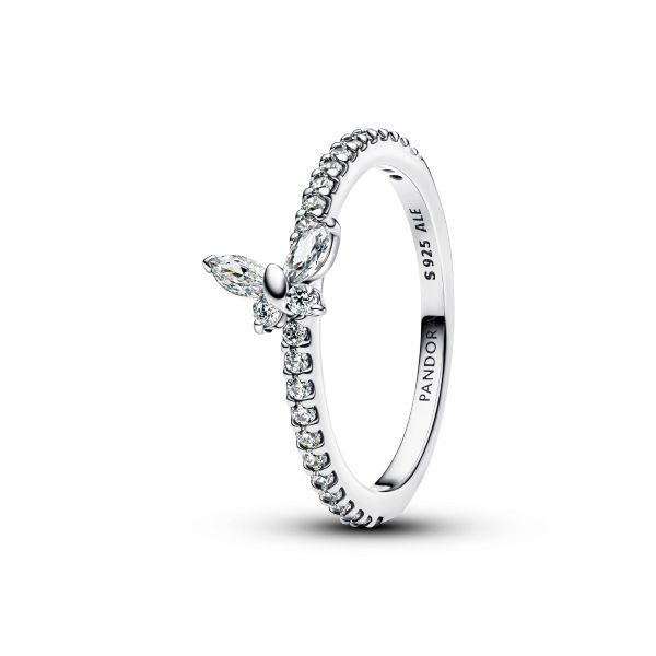 Verleihe deinem Look dezenten Glanz. Dieser Ring aus Sterling-Silber ist mit klaren Cubic Zirkonia besetzt und hat einen schräg auf ihm sitzenden Schmetterling als Symbol für Verwandlung und Schönheit.