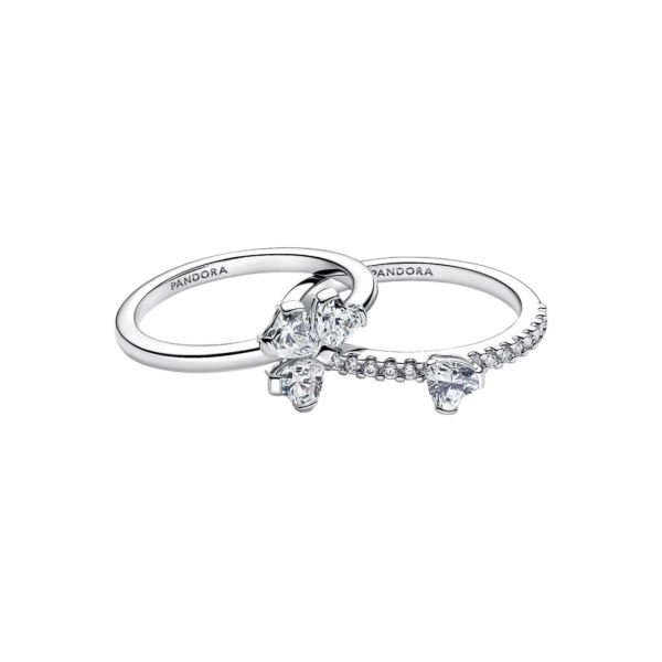 Verdopple das Glück. Unser Set aus Sterling-Silber enthält zwei teilbare Ringe – einen mit drei herzförmigen Steinen und einen mit Herzstein und Pavé-Band. Perfekt für Stacking und Kombinieren.