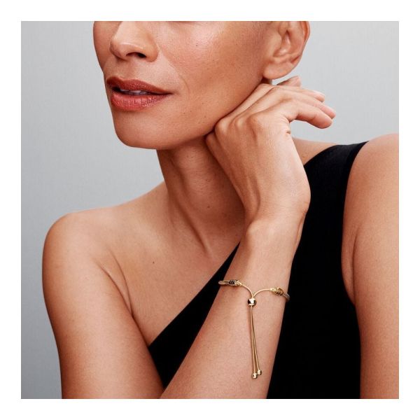 Unser Pandora Moments Schiebeverschluss Schlangen-Gliederarmband ist eine raffinierte Variante des klassischen Freundschaftsarmbands. Das vergoldete Schmuckstück ist mit zwei beweglichen Endkappen versehen – beide sind mit schimmernden Steinen besetzt. Dank des verstellbaren Schiebeverschlusses kannst du es ganz einfach an deine Größe anpassen. Das perfekte Geschenk für eine Freundin und alle, die dir am Herzen liegen. Es kann alleine getragen oder mit deinen Lieblingscharms gestylt werden, indem du eine der beweglichen Endkappen anhebst.