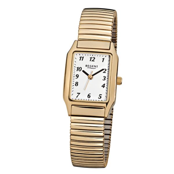 Die Regent F-269 ist eine elegante Damenarmbanduhr mit einem eckigen Gehäuse aus IPG-beschichtetem Stahl in Gelbgold. Das weiße Zifferblatt mit arabischen Zahlen sorgt für klassische Klarheit, während das Quarzwerk zuverlässig von einer Batterie betrieben wird. Ein Zugband aus Edelstahl und kratzfestes Mineralglas runden das Design ab. Wasserdicht bis 3 ATM – stilvoll, schlicht und alltagstauglich.