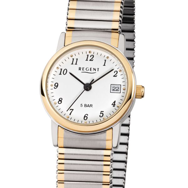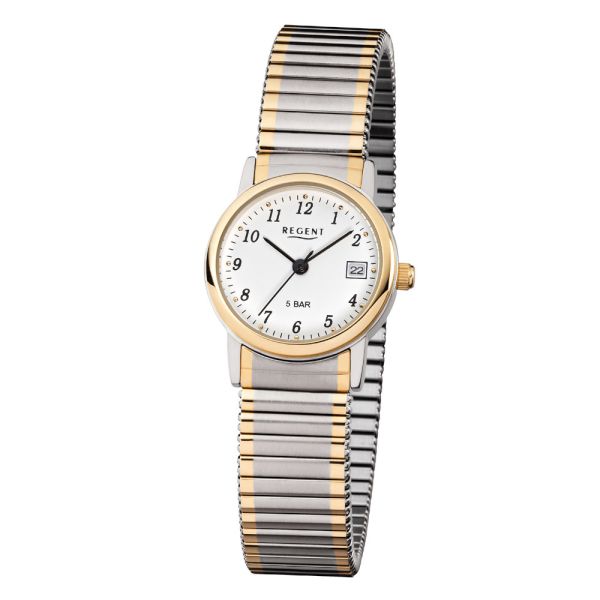 Regent F-889 Damen-Uhr Analog Quarz mit Zug-Armband Silber IP Gold Datum Ø 25 mm