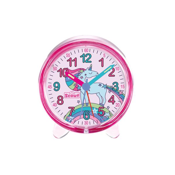 Ein wunderschönes Einhorn Motiv mit Regenbogen ziert das Zifferblatt dieses Weckers. Es ist sehr übersichtlich gestaltet, um das Ablesen der Uhrzeit zu vereinfachen. Das Motiv stammt aus der Original Scout Ranzenserie 'Unicorn'. Auch technisch kann dieser Wecker überzeugen. Er verfügt über ein extrem ruhiges Uhrwerk, eine Alarmwiederholungs-Taste, LED-Zifferblattbeleuchtung. Dieses Weckermodell weckt dich mit einem Beep-Beep Alarm.