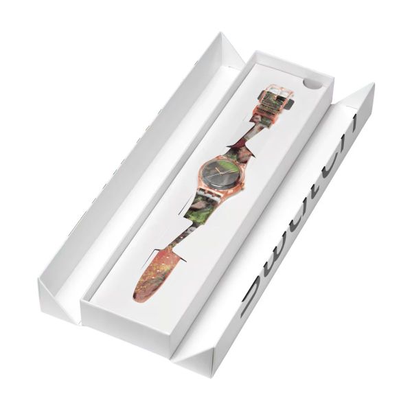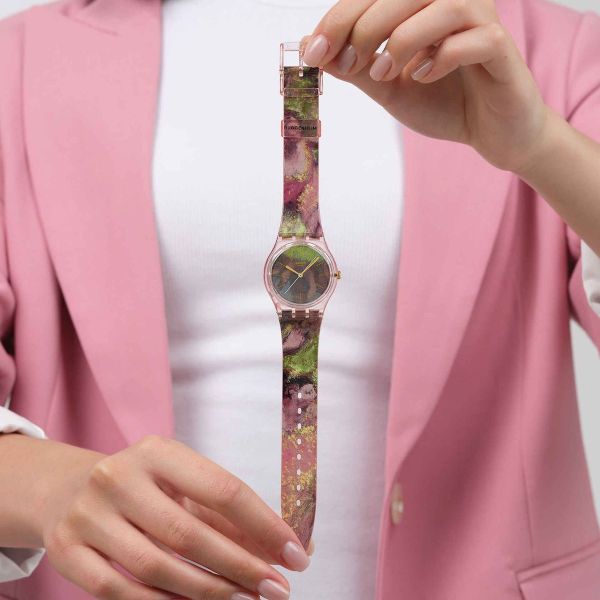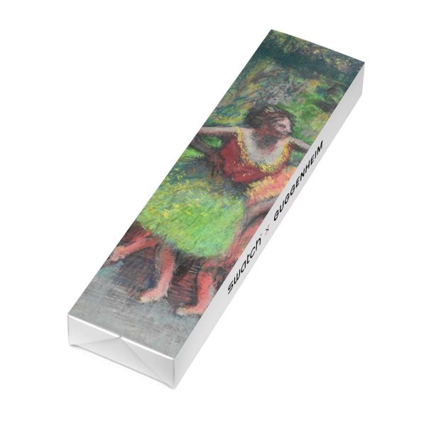 Diese Uhr aus der Swatch x Guggenheim Kollektion besticht durch ein biobasiertes Gehäuse in glänzendem Rosa und einem biobasierten Glas mit goldfarbenen Stundenmarkierungen. Das Zifferblatt und das transparente Armband in glänzendem Rosa sind mit einem Druck von Edgar Degas’ Kunstwerk „Dancers in Green and Yellow“ (Tänzerinnen in Grün und Gelb) versehen. Goldfarbene Stunden- und Minutenzeiger und ein weißer verlängerter Sekundenzeiger zeigen die Uhrzeit an. Die transparente mattrosafarbene Schlaufe ist mit dem Guggenheim-Logo bedruckt und rundet die Uhr zusammen mit der transparenten Schließe in glänzendem Rosa ab. Edgar Degas, Dancers in Green and Yellow, ca. 1903