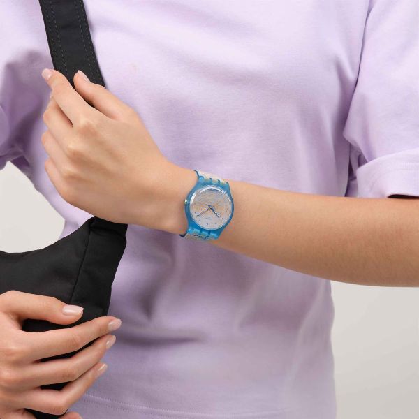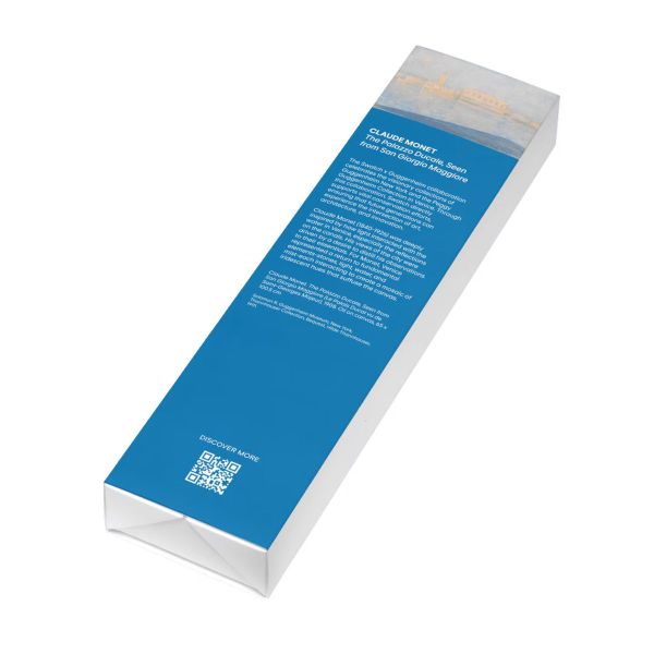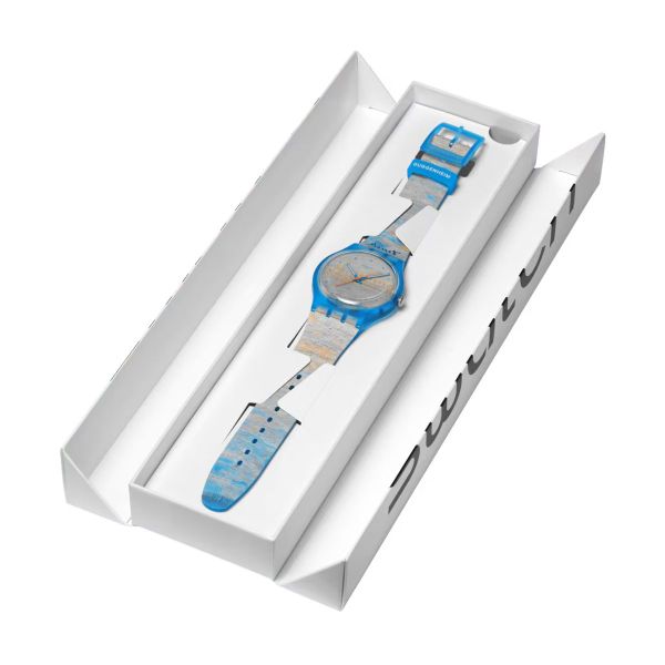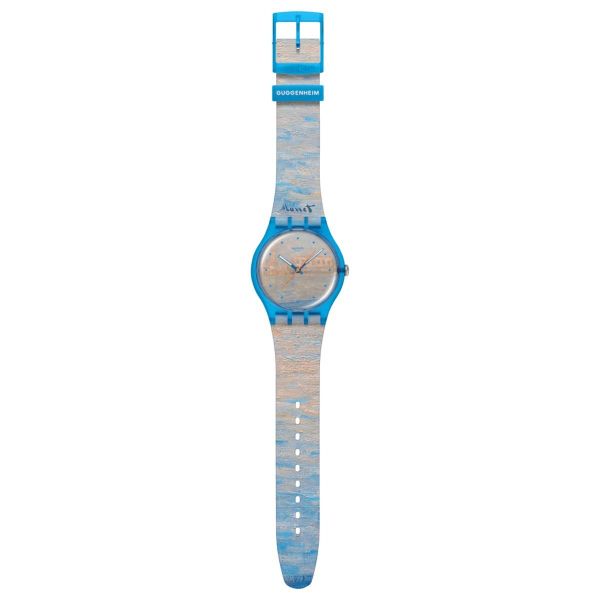 Diese Uhr aus der Swatc x Guggenheim Kollektion verfügt über ein transparentes biobasiertes Gehäuse in Mattblau mit biobasiertem Glas. Das Zifferblatt und das transparente mattblaue Armband sind mit einem Druck von Claude Monets Kunstwerk „The Palazzo Ducale, Seen from San Giorgio Maggiore“ versehen. Der mehrfarbige Druck auf dem Zifferblatt leuchtet unter UV-Licht orange. Fluoreszierende blaue Stunden- und Minutenzeiger und ein verlängerter orangefarbener Sekundenzeiger zeigen die Uhrzeit an. Die transparente mattblaue Schlaufe ist mit dem Guggenheim-Logo bedruckt und rundet gemeinsam mit der transparenten mattblauen Schließe die Uhr ab. Claude Monet, The Palazzo Ducale, Seen from San Giorgio Maggiore, 1908