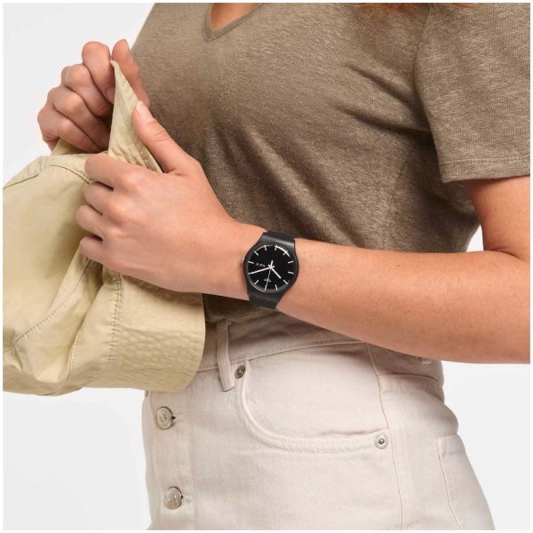 Gegensätze ziehen sich an. Dieses schlicht-raffinierte Schwarzweiß-Modell ist ein modernes Must-have. Die MONO BLACK IN BIOSOURCED Uhr ist eine Klasse für sich – und bringt mit schwarzem Spiegeleffekt-Zifferblatt, biobasiertem Uhrglas, leuchtend weißen Indizes mit Swatch Glow und einem Tag-Datumsfenster auf drei Uhr einiges an Funktionalität mit. Das Gehäuse, Armband, die Schlaufe und Schließe aus uni-mattschwarzem, biologisch gewonnenem Material verleihen dem Klassiker in Schwarz einen zeitgemäßen Look.