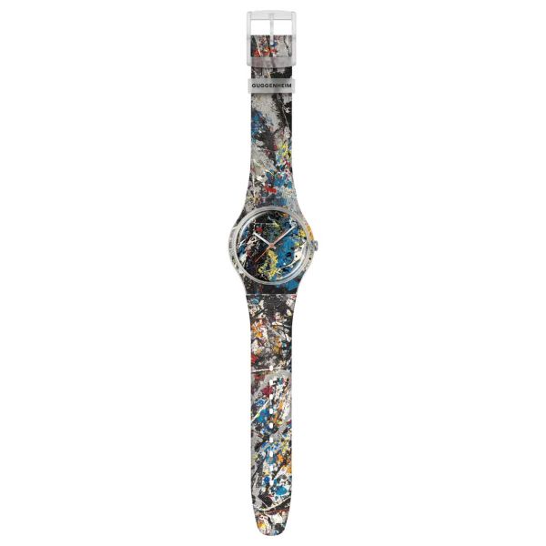 Diese Uhr aus der Swatch x Guggenheim Kollektion ist auf dem Zifferblatt, dem matten transparenten Gehäuse und dem Armband mit einem Druck von Jackson Pollocks Kunstwerk „Alchemy“ versehen. Fluoreszierende silberfarbene Stunden- und Minutenzeiger und ein verlängerter orangefarbener Sekundenzeiger zeigen die Uhrzeit an. Die matte transparente Schlaufe ist mit dem Guggenheim-Logo bedruckt und rundet zusammen mit der matten transparenten Schliesse die Uhr ab. Jackson Pollock, Alchemy, 1947. © Pollock-Krasner Foundation / 2024, ProLitteris, Zurich