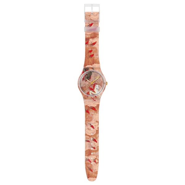 Dieser Zeitmesser in lebendigen Farben ist dem Jahr des Pferdes gewidmet und wurde in Zusammenarbeit mit Yu Wenjie, einem ehemaligen Residenzkünstler des Swatch Art Peace Hotels, entworfen. Das Zifferblatt und das matt-transparente Gehäuse zeigen einen mehrfarbigen Druck mit zwei Pferden vor einem Hintergrund aus Flammen und vorbeiziehenden Wolken. Goldfarbene fluoreszierende Stunden- und Minutenzeiger und ein goldfarbener Sekundenzeiger geben die Zeit an. Der mehrfarbige Druck mit Flammen und Wolken setzt sich auf dem mehrfarbigen Armband fort. Eine matt-transparente Schlaufe und Schließe runden das Design der Uhr ab.