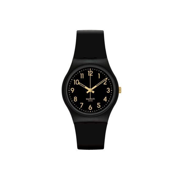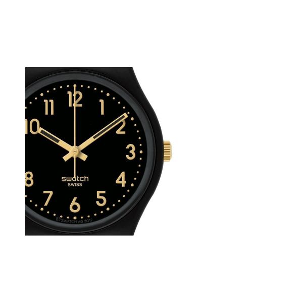 Ein goldener Schimmer ist das auffallende Merkmal dieser Uhr mit schwarzem Armband und Gehäuse aus biobasiertem Material. Die Zahlen auf dem schwarzen Zifferblatt versprechen rund um die Uhr goldene Stunden.