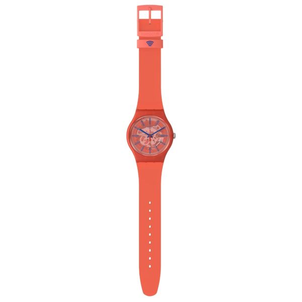Diese rote NEW GENT BIOSOURCED Uhr hat ein transparentes, rotes Zifferblatt mit blauem Aufdruck, blaue Zeiger und ein biobasiertes Uhrglas. Das Armband und Gehäuse dieser SwatchPAY! Uhr bestehen aus matt-hellrotem, biobasiertem Material mit rosa und blauen Zierdetails auf dem Armband.