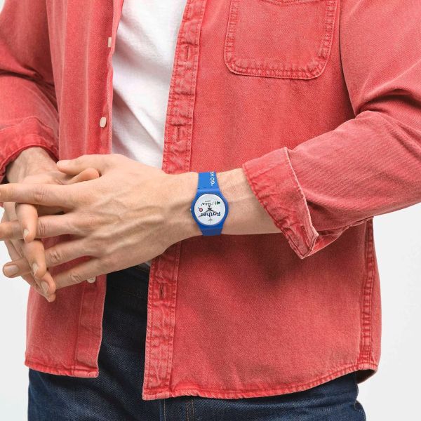 Diese Geschenkuhr in Limited Edition zum Vatertag 2023 mit einem mattblauen, biobasierten Gehäuse und passendem Armband hat ein weiß bedrucktes Zifferblatt und fluroreszierende Zeiger. Die verschiedenfarbigen Herzen im Kalenderrad erinnern deinen Dad, dass du ihn lieb hast.
