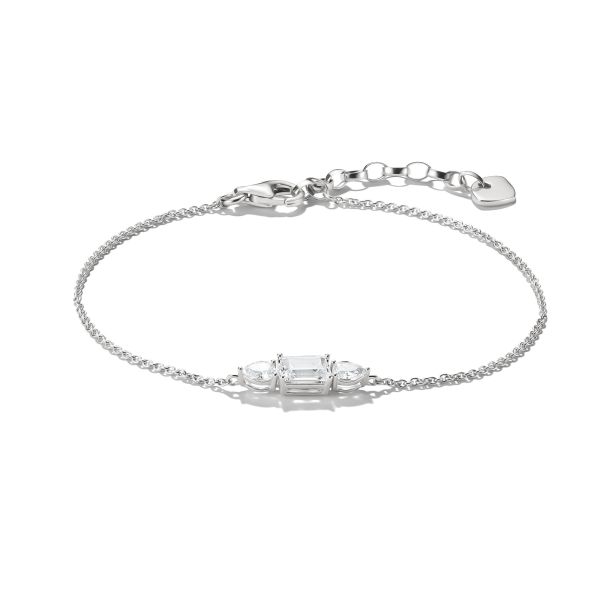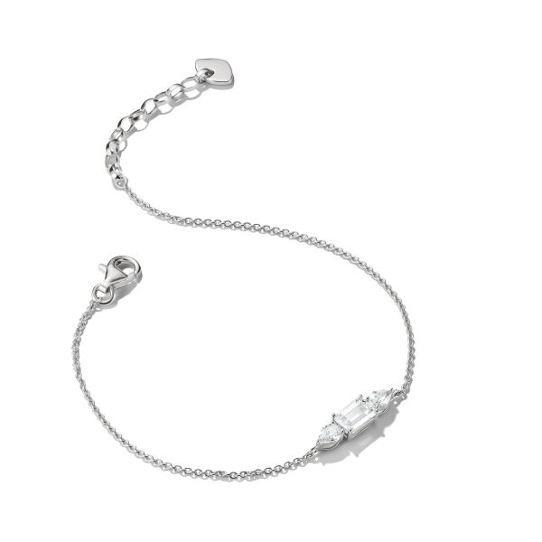 Feine Linien und subtiler Glamour: Dieses zarte Armband aus recyceltem 925 Sterling Silber greift die skulpturale Formensprache der Bold Elegance Linie auf. In der Mitte sitzen weiß funkelnde Zirkoniasteine im Oktagon- und Tropfenschliff, die das Licht bei jeder Bewegung elegant reflektieren und dem Design einen edlen Glanz verleihen. Das filigrane Kettchen legt sich leicht ums Handgelenk und lässt sich mithilfe des Verlängerungskettchens flexibel von 16 bis 19 cm anpassen. Ob im Alltag oder zu besonderen Anlässen – dieses Armband ist ein dezentes Statement für alle, die modernen Minimalismus mit femininer Eleganz kombinieren wollen.