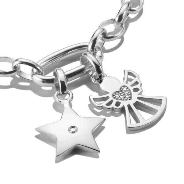 Beschützer der Liebe: Dieser Charm ist aus recyceltem 925 Sterling Silber in der Form eines filigranen Engels gestaltet. Das kunstvolle Design zeigt sich mit detaillierten Cut-outs und einem Herzen in der Mitte. Dieses ist mit kleinen, funkelnden Zirkonia-Steinen in Weiß besetzt. Die Gestaltung spiegelt gekonnt die Bedeutung dieses Charms wider. Dank seiner Anhänger-Öse kannst du ihn mühelos jeden Tag tragen. Nach Lust und Laune lässt er sich an Armbändern und Ketten befestigen sowie mit weiteren Anhängern kombinieren.