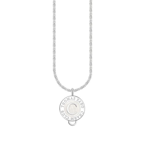 Kette mit Charm-Carrier. Feine Halskette mit Coin-Charm-Carrier mit „THOMAS SABO Charm Club“-Gravur und C als Mittelpunkt. Die Coin ist handbemalt mit schimmernder, weißer Kaltemaille. An der Coin können Charms angebracht werden. Die Kette ist längenverstellbar mit Verlängerungskette von 40 bis 45 cm.