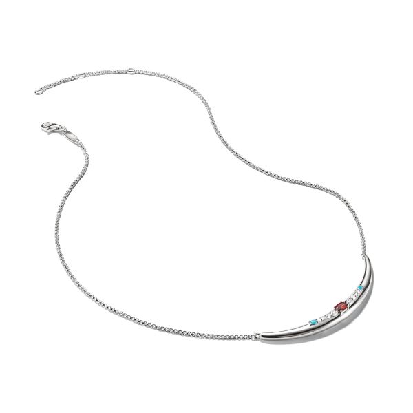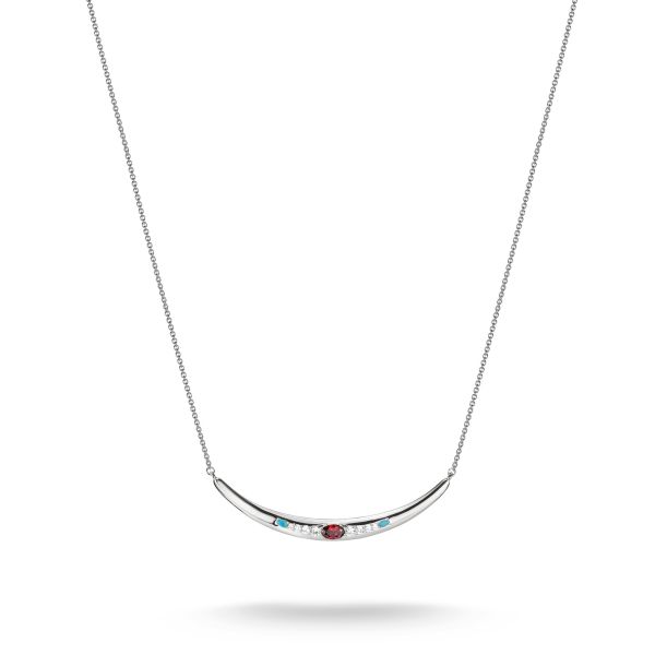 Wie ein zentrierter Gedanke aus Licht: Das fest gearbeitete Halbform-Mittelteil trägt eine fein abgestimmte Steinreihe – im Fokus ein granatroter Zirkonia, flankiert von weißen und türkisen Steinen. Ruhige Linienführung trifft auf ausdrucksstarke Symbolik und schenkt dir klare, ausgewogene Präsenz. Ein Elyndra-Collier für Momente, in denen du Leichtigkeit mit Tiefe verbindest.