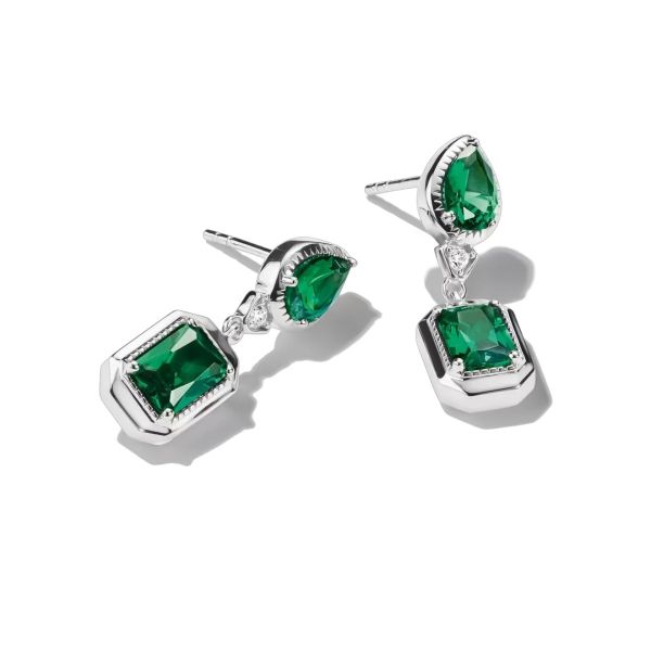 Diese Elyndra Ohrstecker setzen auf ein spannendes Zusammenspiel aus Form und Farbe. Ein smaragdgrüner Stein im Tropfenschliff trifft auf einen darunter gefassten Oktagon-Stein im gleichen Farbton und erzeugt eine elegante, vertikale Silhouette. Zwischen beiden Elementen sitzt ein kleiner, rundgeschliffener weißer Zirkonia, der das Licht reflektiert und das Design subtil aufhellt. Die klaren Linien und die Kombination unterschiedlicher Schliffe verleihen den Ohrringen eine moderne, feminine Ausstrahlung – ideal für stilvolle Looks mit Farbstatement.