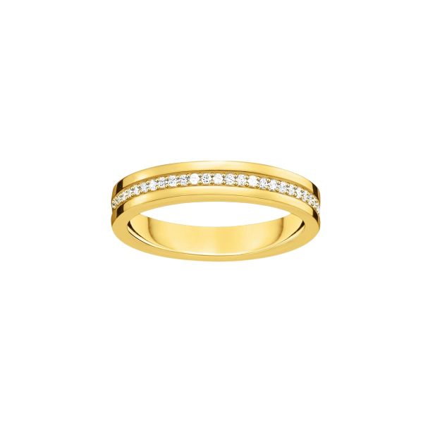 Zeitloser Kontrast: Der Bandring aus hochwertigem 925er Sterlingsilber ist hochkarätig mit 750er Gelbgold vergoldet. Er begeistert mit einer Liaison aus klassischer Eleganz und modernem Purismus. Highlight des schlichten Designs ist ein schmaler Ring in der Mitte, der rundum mit kleinen, weißen Zirkonia-Steinen besetzt ist. Der Ringschaft ist für hohen Tragekomfort sanft gerundet. In verschiedenen Größen verfügbar, eignet sich der goldfarbene Bandring hervorragend als Geschenk sowie Zeichen für Verbundenheit und Zuneigung.