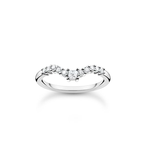 • Ring aus 925er Sterlingsilber in ausgefallenem Design • Stilisierte Kette aus weißen Zirkonia-Steinen mit quadratischem Centerstein • Angenehmes Tragegefühl: innen leicht gerundete Ringschiene