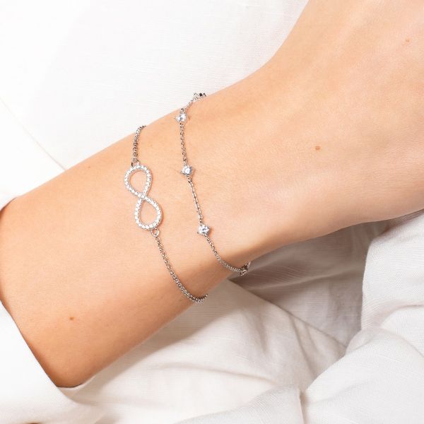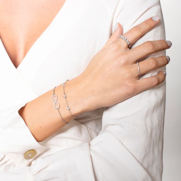 Dieses zarte Schmuckstück besteht aus hochwertigem 925/- Sterlingsilber. Funkelnde Zirkonia-Steine legen sich zwischen das feine Armband und sorgen für einen Eyecatcher auf dem Handgelenk.