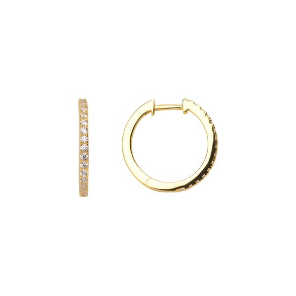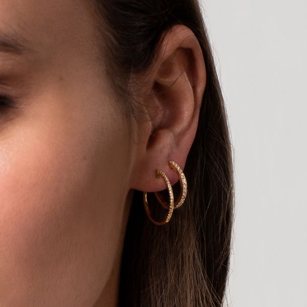 Die klassische Creole aus 18 Karat vergoldetem 925/- Sterlingsilber bekommt ein funkelndes Update! Großzügige Zirkonia-Steine schmücken das Accessoire und sorgen für leuchtende Akzente.