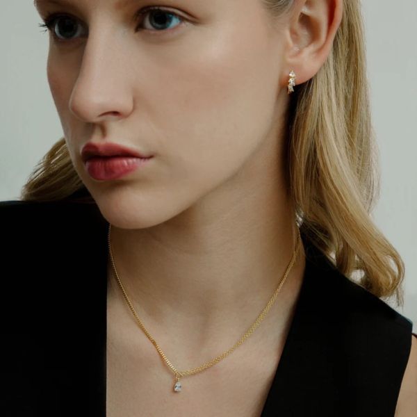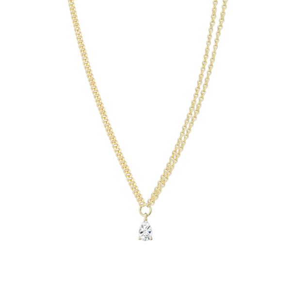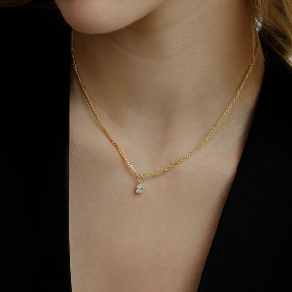 Die SUNDOWN Halskette aus hochwertigem 925/- Sterlingsilber, veredelt mit einer 18 Karat Vergoldung, verbindet ein klassisches Design mit einem modernen Twist. Der tropfenförmig geschliffene Zirkonia-Anhänger sorgt für feminines Funkeln, während das asymmetrische Kettendesign mit zwei feinen Ketten auf einer Seite dem Look eine zeitgemäße Note verleiht. Auch im Halsketten-Layering lässt sie sich stilvoll kombinieren.