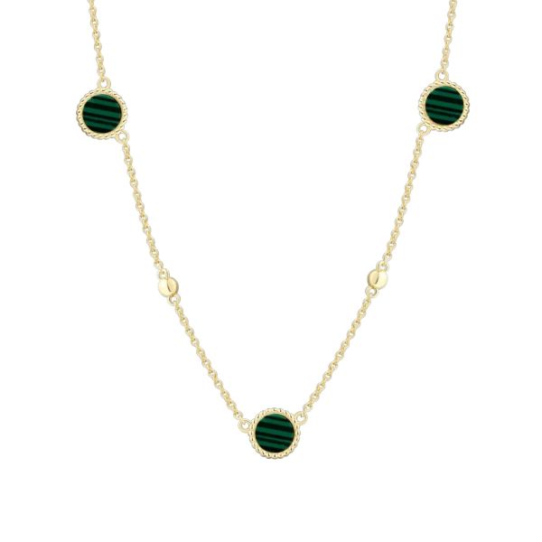 Die ORBIT Halskette aus 925/- Sterlingsilber mit einer 18 Karat Vergoldung ist mit drei runden Malachit-Details gestaltet, die dem Schmuckstück eine markante, natürliche Note verleihen. Die charakteristische grüne Maserung des Malachits setzt gezielte Farbakzente und hebt sich harmonisch von der feinen Kette ab. Die Halskette lässt sich vielseitig tragen und ergänzt den Look sowohl einzeln als auch zusammen mit weiteren Halsketten im Layering auf stilvolle Weise.