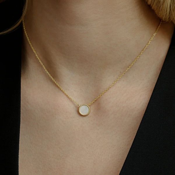 Die ORBIT Halskette aus 925/- Sterlingsilber mit einer 18 Karat Vergoldung ist mit einem runden Perlmutt-Anhänger gestaltet, der dem Schmuckstück eine helle, schimmernde Note verleiht. Der sanfte Glanz des Perlmutts harmoniert mit der feinen Kette und der warmen Vergoldung und sorgt für eine moderne, zurückhaltende Ausstrahlung. Solo getragen wirkt die Halskette dezent und elegant, im Halsketten-Layering lässt sie sich ideal mit weiteren Halsketten kombinieren und ergänzt den Look auf stilvolle Weise.